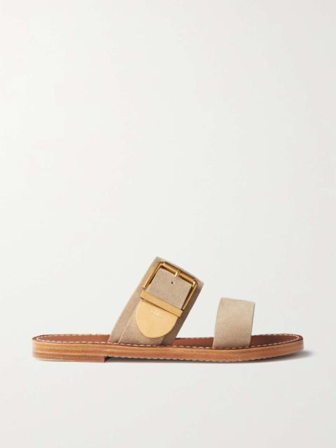 EDITORS'NOTES Chloé's 'Rebecca' shoes may range in shapes, but the defining detail between them all is the gold-tone buckle adorning the straps. These slides are made from soft suede in a neutral beige and have signature topstitching outlining the footbed. SIZE & FIT - Fits true to size, take your normal size - Only available in full sizes, go up to the nearest whole size if you take a half size - Italian sizing DETAILS & CARE - Slight heel - Beige suede (Calf) - Slip on