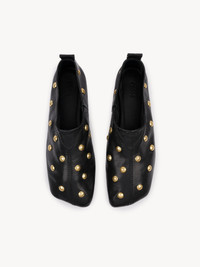 DESCRIPTION These Rita flats are crafted from grained buffalo leather embellished with oversized gold-tone cabochon studs. Tonal geometric stitching and an embossed Chloe logo finish these comfortable slipper shoes. PRODUCT DETAILS Flat shoe Upper: buffalo leather Inner sole: lambskin Main lining: lambskin Sole: cowhide Fit true to size, European sizing - Slip-on To make this product, Chloe worked with Leather Working Group (LWG) certified leather manufacturers. LWG certifies tanneries based on their water and energy usage, management of chemicals, solid waste, and wastewater. Color: Black Item code: CH26S16TUR001 CARE INSTRUCTIONS This item is crafted in a fine and delicate material. We recommend you take special care when wearing jewelry or accessories that may catch or pull the fabric to keep its quality intact.