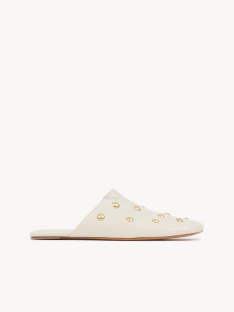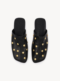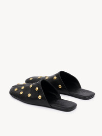 DESCRIPTION These Rita mules are crafted from grained buffalo leather embellished with oversized gold-tone cabochon studs. Tonal geometric stitching and an embossed Chloe logo finish these comfortable slides. PRODUCT DETAILS Flat mule Upper: buffalo leather Inner sole: buffalo leather Main lining: lambskin Sole: cowhide Fit true to size, European sizing - Slip-on To make this product, Chloe worked with Leather Working Group (LWG) certified leather manufacturers. LWG certifies tanneries based on their water and energy usage, management of chemicals, solid waste, and wastewater. Color: Black Item code: CH26S16SUR001 CARE INSTRUCTIONS This item is crafted in a fine and delicate material. We recommend you take special care when wearing jewelry or accessories that may catch or pull the fabric to keep its quality intact.