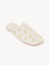 DESCRIPTION These Rita mules are crafted from grained buffalo leather embellished with oversized gold-tone cabochon studs. Tonal geometric stitching and an embossed Chloe logo finish these comfortable slides. PRODUCT DETAILS Flat mule Upper: buffalo leather Inner sole: buffalo leather Main lining: lambskin Sole: cowhide Fit true to size, European sizing - Slip-on To make this product, Chloe worked with Leather Working Group (LWG) certified leather manufacturers. LWG certifies tanneries based on their water and energy usage, management of chemicals, solid waste, and wastewater. Color: Eggshell Item code: CH26S16SUR122 CARE INSTRUCTIONS This item is crafted in a fine and delicate material. We recommend you take special care when wearing jewelry or accessories that may catch or pull the fabric to keep its quality intact.