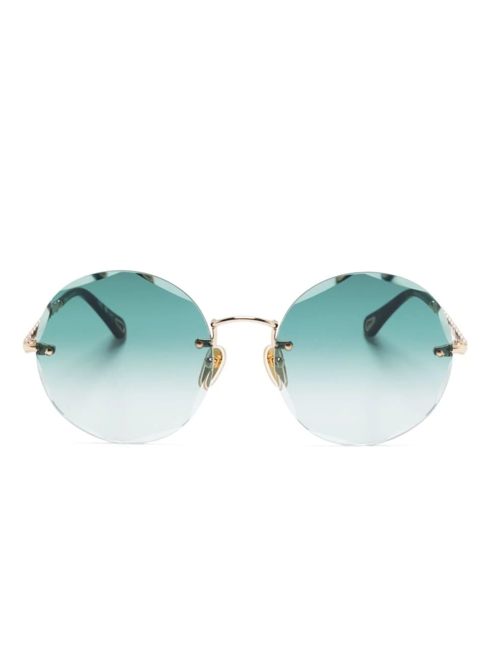 round-frame sunglasses Highlights - Emerald green/gold-tone/havana brown - Acetate/metal - Round frame - Rimless lenses - Uv-protective green tinted lenses - Nose pads - Scallop edge straight arms - Logo-engraved arm - Curved tips - These glasses come with a protective case. Imported Composition Acetate 100%, Metal 100% SIZE & FIT Measurement Arm Length 5.51 in(14 cm) Bridge Width 0.74 in(1.9 cm) Lens Diameter 2.24 in(5.7 cm) Total Width 5.51 in(14 cm)