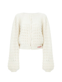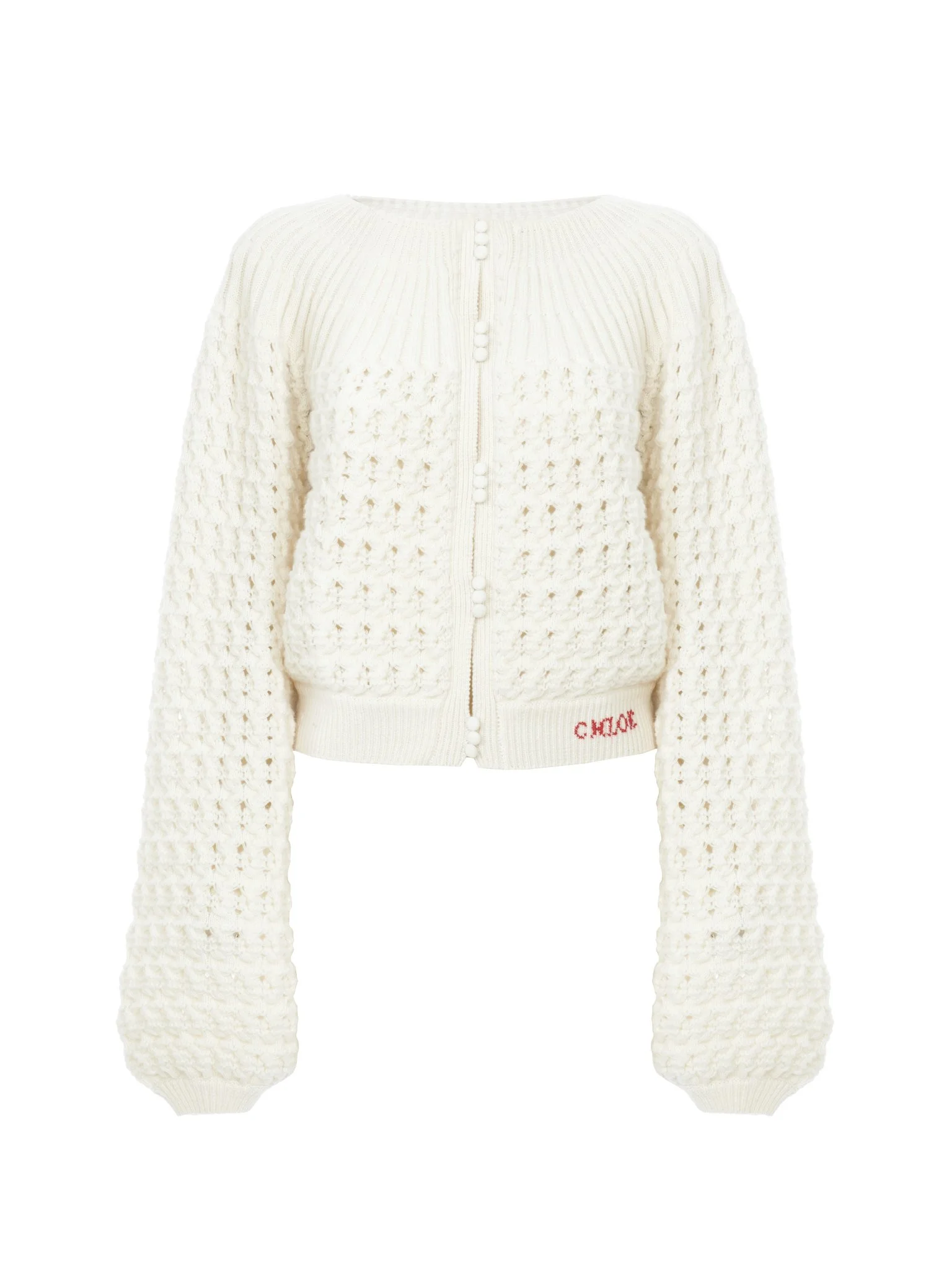 Round-neck cardigan in a lower-impact chunky wool and cashmere knit with generous sleeves, fabric-covered buttons, ribbed trims and Chloe logo embroidery at the hem. PRODUCT DETAILS Cardigan outer shell: 70% Wool, 30% Cashmere wool Fit: straight - The model is 5'10" (178 cm) and wears a prototype in size S - Knitted cardigan - Fabric-covered buttons through front The wool used in this product comes from a farm that respects animal welfare, maintains soil health, protects biodiversity and promotes native species. Color: Iconic Milk Item code: CH25WMP07590107