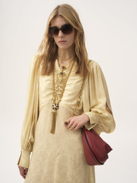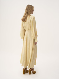 Ruched long dress in organic silk with a roses jacquard, cut in a fluid silhouette with fabric-covered buttons along the V-neck front and at the flared cuffs. PRODUCT DETAILS Ruched long dress outer shell: 100% Silk Fit: fluid, long - The model is 5'10" (178 cm) and wears a prototype in size 36 - Long silk dress - Invisible left-side zipper - Fabric-covered buttons at front & cuffs Organic silk manufacturing restricts the use of pesticides, insecticides or harsh chemicals and incorporates methods that respect biodiversity, improve soil quality and reduce water consumption. This product was made by Marie Helene Couture, a long-standing partner of Chloe based in Morlaas, France. Marie Helene Couture excels in the specialized technique of couture "flou". Their expertise aligns with the rigorous standards set by the "metiers de la mode, vetement flou" certification, ensuring a high level of professional aptitude in this delicate and skilled art form. Color: Powder Yellow Item code: CH25ARO31115753