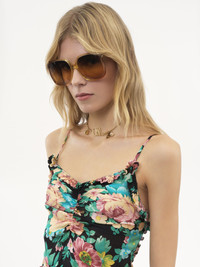 Ruched tank top in organic silk charmeuse with a bouquet print inspired by the Maison's heritage. Ruffled trims, thin straps and fabric-covered buttons finish this piece. PRODUCT DETAILS Ruched tank top outer shell: 100% Silk Fit: fitted We recommend taking one size above your regular size. - The model is 5'10" (178 cm) and wears a prototype in size 36 - Floral top - Fabric-covered buttons at the side Care: dry cleaning only This product is made of a fragile material. Take special care when wearing jewelry or accessories that may damage the product by catching on or pulling the fabric. Any uneven weaving is due to the nature of the material. Organic silk manufacturing restricts the use of pesticides, insecticides or harsh chemicals and incorporates methods that respect biodiversity, improve soil quality and reduce water consumption. This product was made in collaboration with Akanjo, a certified WFTO supplier. Akanjo is a social enterprise located in Madagascar that places equal pay and employees' health & wellbeing at the core of their priorities. A long-standing partner of Chloe for 15 years, Akanjo is also committed to training and promoting craftsmanship. Color: Black Item code: CH25UHT18464001