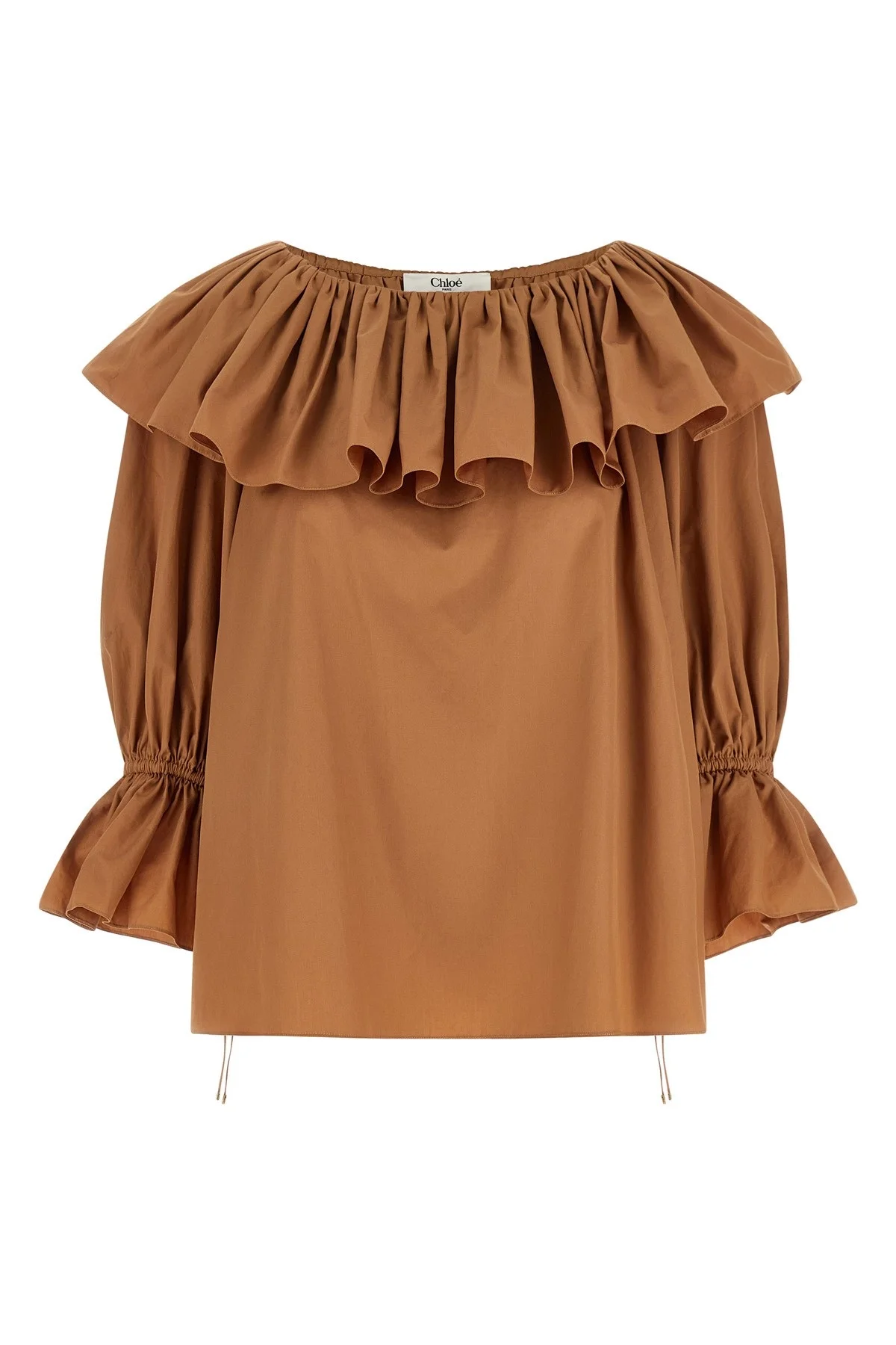 cod. CH26UH10114426U Cotton poplin blouse with boat neckline with ruffles, flared silhouette, 3/4 sleeves with drawstring and flared cuffs. Color: Beige Size & Fit: true to size fit - FRENCH size Composition: 100% cotton Made in: Slovakia