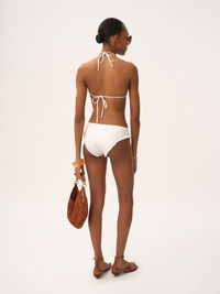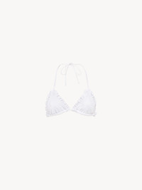 DESCRIPTION Ruffled bikini top in stretch broderie anglaise, tied at the neck and back. PRODUCT DETAILS Bikini top outer shell: 80% Polyamide, 20% Elastane Lining: 83% Polyamide, 17% Elastane Fit: fitted - The model is 5'10" (178 cm) and wears a prototype in size 36 - Swimsuit top - Ties at neck & back Color: White Item code: CH25AMB11471101 CARE INSTRUCTIONS To preserve the integrity of your garment wash it by hand at a maximum of 40°C, ensuring its delicate fibers are treated with care. This garment cannot withstand any bleaching agent. To maintain its shape, refrain from ironing this garment. To best preserve its texture and form, do not dry clean this garment. To maintain its delicate nature, do not wet clean this garment. To best preserve its form and texture, please do not tumble dry this garment. TRACEABILITY Better traceability is central to improving our materials as well as social and environmental practices. Dyeing: Italy Weaving: Italy