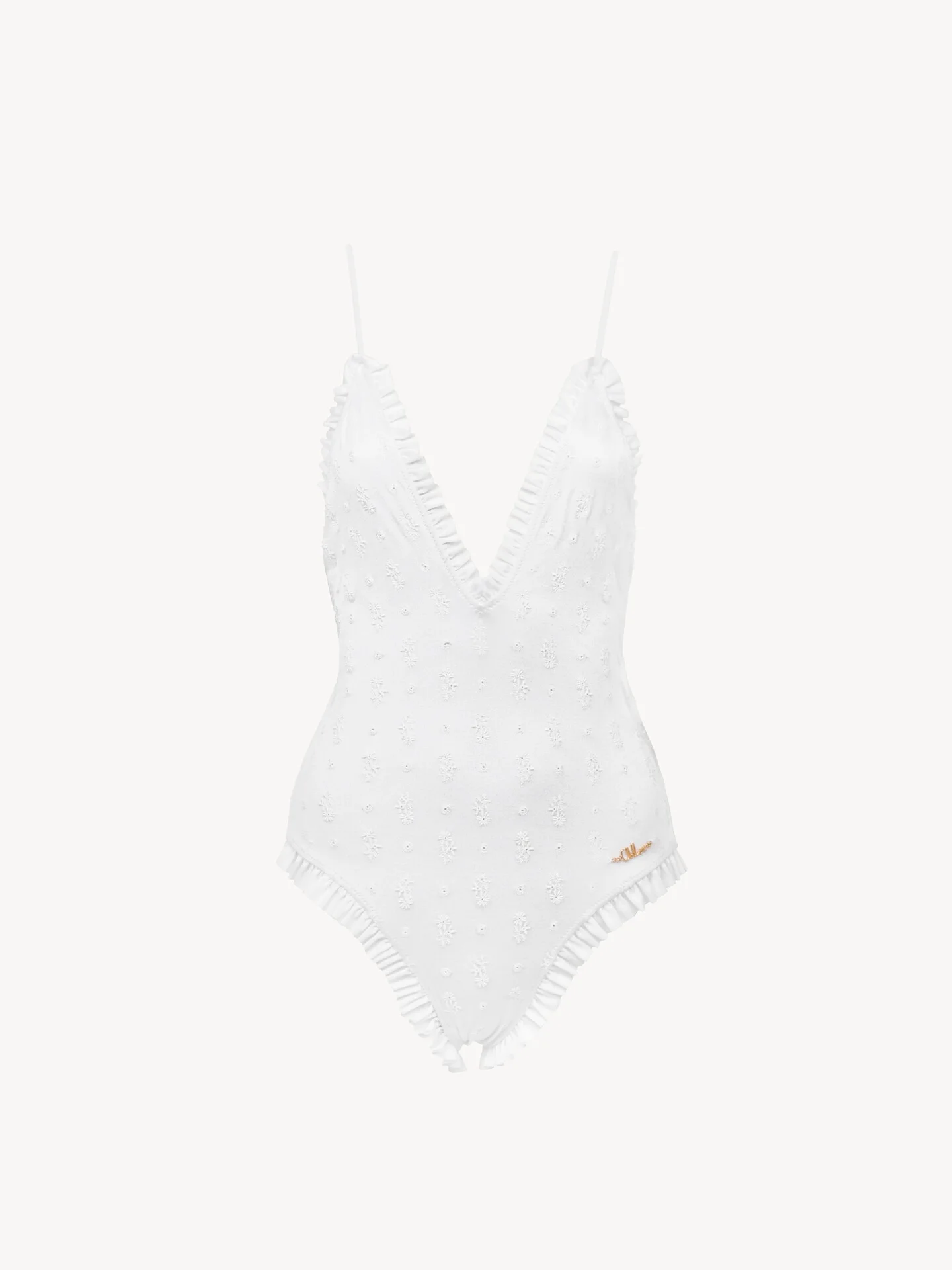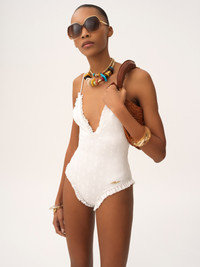 DESCRIPTION One-piece swimsuit in stretch broderie anglaise, featuring a V-neck, thin straps and ruffle trims. A gold-tone Chloe logo plate signs the left hip. PRODUCT DETAILS One-piece swimsuit outer shell: 80% Polyamide, 20% Elastane Inner lining: 83% Polyamide, 17% Elastane Fit: fitted - The model is 5'10" (178 cm) and wears a prototype in size 36 - Ruffled swimsuit - No fastenings Color: White Item code: CH25AMB12471101 CARE INSTRUCTIONS To preserve the integrity of your garment wash it by hand at a maximum of 40°C, ensuring its delicate fibers are treated with care. This garment cannot withstand any bleaching agent. To maintain its shape, refrain from ironing this garment. To best preserve its texture and form, do not dry clean this garment. To maintain its delicate nature, do not wet clean this garment. To best preserve its form and texture, please do not tumble dry this garment. TRACEABILITY Better traceability is central to improving our materials as well as social and environmental practices. Dyeing: Italy Weaving: Italy