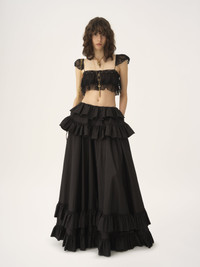 Fluid ruffled bralette in organic silk mousseline, featuring lace trims, cap sleeves and fabric-covered buttons. PRODUCT DETAILS Bralette outer shell: 100% Silk Main lacework: 80% Cotton, 20% Polyamide Secondary lacework: 90% Cotton, 10% Polyamide Inside trim: 89% Cotton, 11% Polyamide Fit: fluid - The model is 5'10" (178 cm) and wears a prototype in size 36 - Silk bralette - Fabric-covered buttons at front Organic silk manufacturing restricts the use of pesticides, insecticides or harsh chemicals and incorporates methods that respect biodiversity, improve soil quality and reduce water consumption. Color: Black Item code: CH25WHT33001001