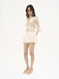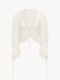 V-neck ruffle top in embroidered lace inspired by the Maison's heritage. The gathered silhouette features ruffle trims and drawstring ties with gold-tone metal tips. PRODUCT DETAILS V-neck ruffle top outer shell: 100% Polyester Braid: 53% Polyester, 47% Silk Collar: 100% Silk Buttons: 100% Mother-of-pearl Fit: fluid - The model is 5'10" (178 cm) and wears a prototype in size 36 - White lace top - Mother-of-pearl buttons at front - Drawstring ties with metal tips Care: dry cleaning only This product was made in collaboration with Akanjo, a certified WFTO supplier. Akanjo is a social enterprise located in Madagascar that places equal pay and employees' health & wellbeing at the core of their priorities. A long-standing partner of Chloe for 15 years, Akanjo is also committed to training and promoting craftsmanship. Color: Whisper White Item code: CH25UHT26099113