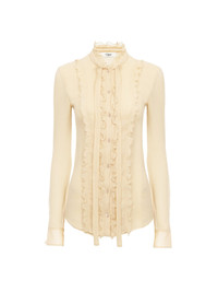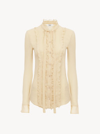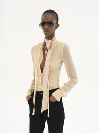 Fitted blouse in iconic sheer organic silk crepon, featuring a front tie and ruffles. PRODUCT DETAILS Fitted blouse outer shell: 100% Silk Buttons: 100% Mother-of-pearl Fit: fitted - The model is 5'10" (178 cm) and wears a prototype in size 36 - Ruffled silk blouse - Front tie - Mother-of-pearl buttons through front & at cuffs Care: dry cleaning only Organic silk manufacturing restricts the use of pesticides, insecticides or harsh chemicals and incorporates methods that respect biodiversity, improve soil quality and reduce water consumption. Color: Light Sand Item code: CH25SHT07124291