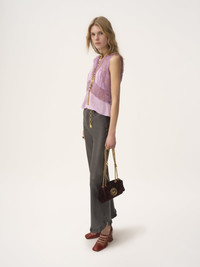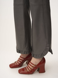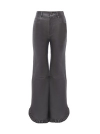Flared pants in soft lambskin with a ruffled hem. PRODUCT DETAILS Flared pants outer shell: 100% Sheepskin Main lining: 62% Viscose, 38% Cotton Pocket lining: 100% Cotton Fit: flared - The model is 5'10" (178 cm) and wears a prototype in size 36 - Leather pants - Front zipper & Chloe-engraved button fastening - Side pockets & mini front patch pocket - Belt loops To make this product, Chloe worked with Leather Working Group (LWG) certified leather manufacturers. LWG certifies tanneries based on their water and energy usage, management of chemicals, solid waste, and wastewater. Color: Sandy Black Item code: CH25ACP30204011