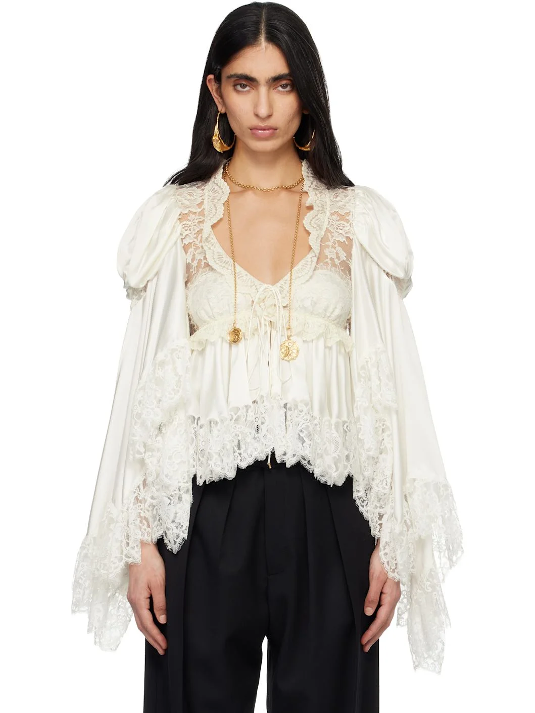 Silk satin and lace blouse. · Scalloped lace trim, ruffles, and gathering throughout · Y-neck · Self-tie fastening at open front · Hardware at fastening · Puff sleeves · Flared cuffs Supplier color: Iconic Milk Body 1: 100% silk. Body 2: 56% cotton, 44% polyamide. Trim 1: 60% cotton, 40% polyamide. Trim 2: 68% cotton, 32% polyamide. Trim 3: 100% polyester. Made in Madagascar 252338F107004
