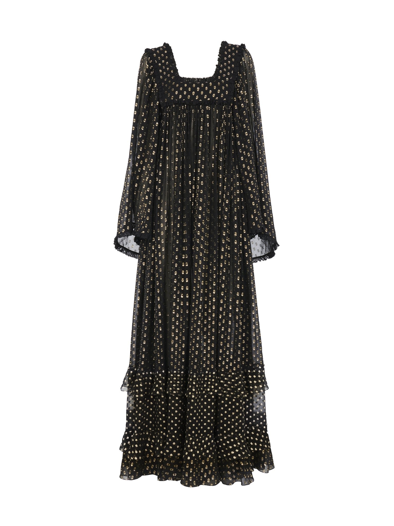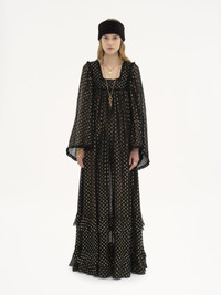 Ruffled maxi dress in light silk with silk-mix lining, detailed with lurex dots jacquard and cut in a fluid, square-neck silhouette. Ruffles and lace trims finish this piece. PRODUCT DETAILS Ruffled maxi dress outer shell: 92% Silk, 8% Metallized polyester Braid: 90% Cotton, 10% Polyamide Body lining: 76% Acetate fiber, 24% Silk Lining: 68% Acetate fiber, 32% Silk Fit: maxi length, fluid - The model is 5'10" (178 cm) and wears a prototype in size 36 - Fluid evening dress - Back zipper Care: dry cleaning only This product was made in collaboration with Akanjo, a certified WFTO supplier. Akanjo is a social enterprise located in Madagascar that places equal pay and employees' health & wellbeing at the core of their priorities. A long-standing partner of Chloe for 15 years, Akanjo is also committed to training and promoting craftsmanship. Color: Black Item code: CH25SRO50414001