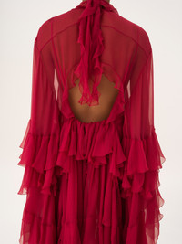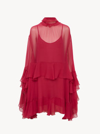 DESCRIPTION High-neck ruffled mini dress in iconic organic silk mousseline with a separate silk-mix lining, featuring maxi long sleeves and a cut-out back. PRODUCT DETAILS Ruffled mini dress outer shell: 100% Silk Separate lining: 90% Acetate fiber, 10% Silk Fit: fluid, mini length - The model is 5'10" (178 cm) and wears a prototype in size 36 - Long-sleeve silk dress - Fabric-covered button at back of neck - Separate lining Organic silk manufacturing restricts the use of pesticides, insecticides or harsh chemicals and incorporates methods that respect biodiversity, improve soil quality and reduce water consumption. This product was made in collaboration with Akanjo, a certified WFTO supplier. Akanjo is a social enterprise located in Madagascar that places equal pay and employees' health & wellbeing at the core of their priorities. A long-standing partner of Chloe for 15 years, Akanjo is also committed to training and promoting craftsmanship. Color: Garnet Pink Item code: CH26SRO520016AZ CARE INSTRUCTIONS To preserve the integrity of your garment, please refrain from washing, entrusting its care to professional cleaning services for optimal maintenance. This garment cannot withstand any bleaching agent. To maintain its shape, gently iron this garment at a maximum sole plate temperature of 110°C, taking care to avoid any harsh pressure while ironing. Entrust this garment to a specialist for mild cleaning with tetrachloroethylene and solvent F, ensuring its delicate nature is maintained with the most care. To best preserve its form and texture, please do not tumble dry this garment. To maintain its delicate nature, do not wet clean this garment. TRACEABILITY Better traceability is central to improving our materials as well as social and environmental practices. Dyeing: France Finishing: France Weaving: France