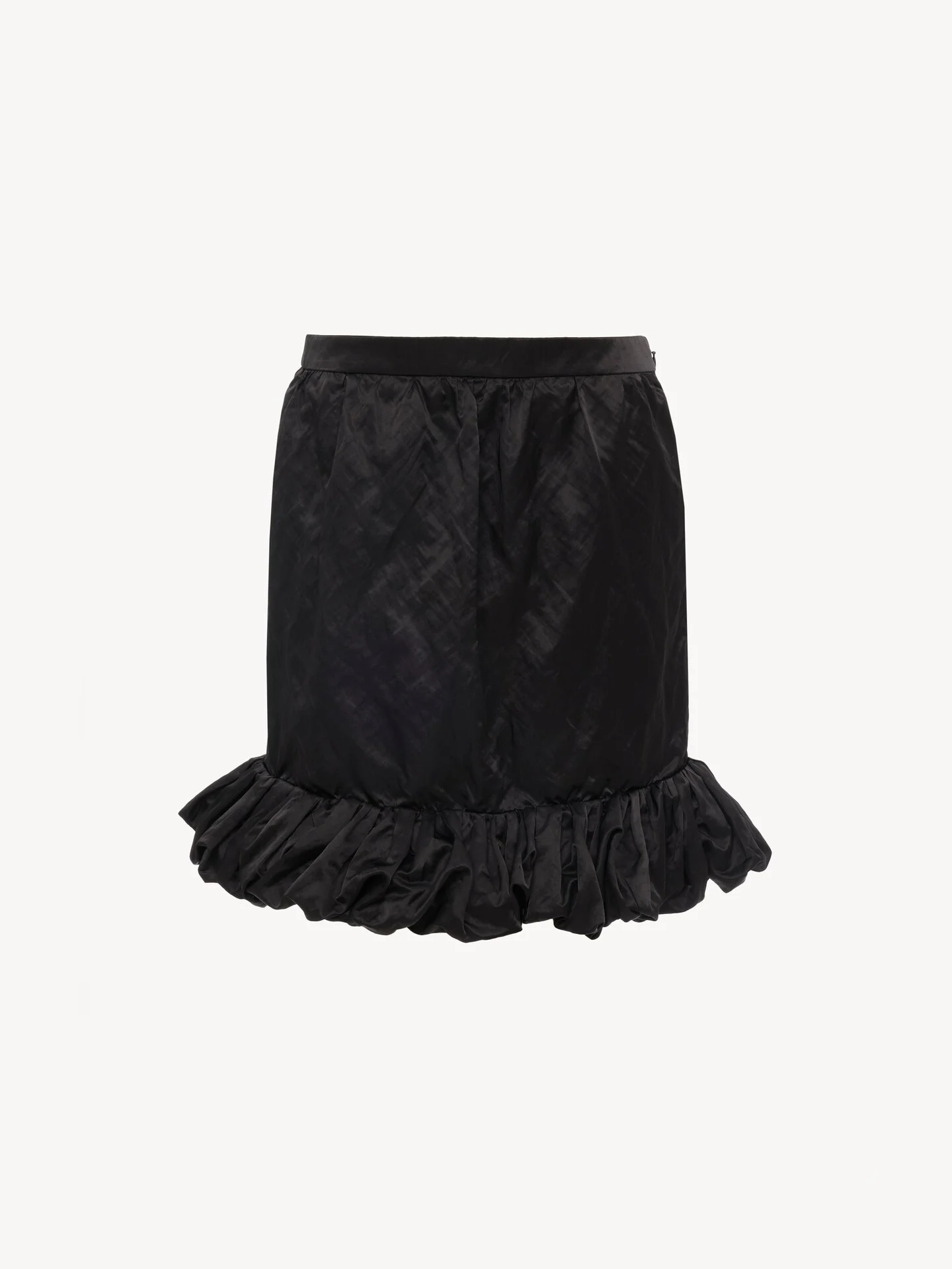 DESCRIPTION Mini skirt in washed technical satin with a ruffled hem. PRODUCT DETAILS Ruffled mini skirt outer shell: 49% Cotton, 43% Polyamide, 8% Steel Lining: 76% Acetate fiber, 24% Silk Inner: 100% Polyamide Fit: straight - The model is 5'10" (178 cm) and wears a prototype in size 36 - Ruffled satin skirt - Side hook & zipper fastening Color: Black Item code: CH26SJU01010001 CARE INSTRUCTIONS To preserve the integrity of your garment, please refrain from washing, entrusting its care to professional cleaning services for optimal maintenance. This garment cannot withstand any bleaching agent. To maintain its shape, gently iron this garment at a maximum sole plate temperature of 110°C, taking care to avoid any harsh pressure while ironing. Entrust this garment to a specialist for mild cleaning with tetrachloroethylene and solvent F, ensuring its delicate nature is maintained with the most care. To best preserve its form and texture, please do not tumble dry this garment. To maintain its delicate nature, do not wet clean this garment. TRACEABILITY Better traceability is central to improving our materials as well as social and environmental practices. Dyeing: Italy Finishing: Italy Weaving: Italy