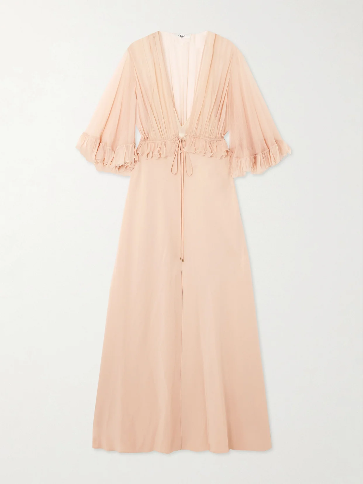 Cut from crepe with a plunging neckline, Chloe's airy dress is overlaid with a billowing silk-crepon cape that's trimmed with delicate ruffles. It has an adjustable drawstring so you can cinch the waist and falls to a sweeping maxi hem.