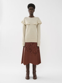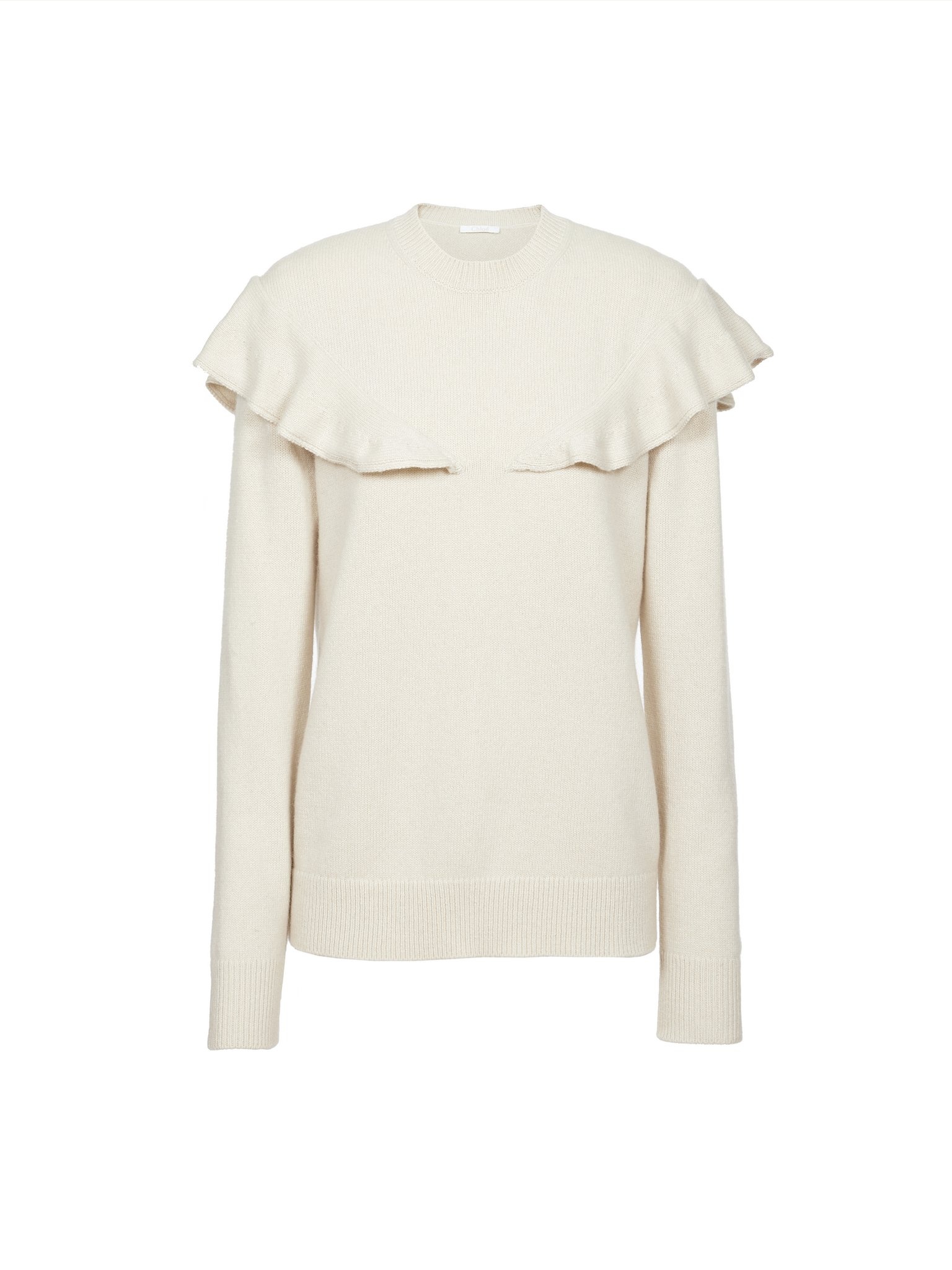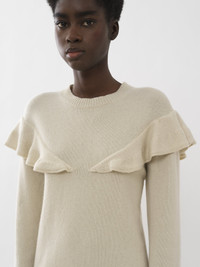Made from iconic recycled cashmere blended with virgin cashmere fibers, this ruffled sweater has a loose crew-neck silhouette with casual dropped shoulders. V-shaped flounces embellish the chest and shoulders, adding romantic detail to this soft cashmere sweater. PRODUCT DETAILS Ruffled sweater main material: 100% Cashmere Care: dry cleaning only, sensitive to friction Fit: loose, long sleeves - The model is 5'10" (178 cm) and wears a prototype in size S - Cashmere sweater - Slips on Recycled cashmere keeps its natural softness and insulating power, but with a reduced environmental impact. Using recycled cashmere enables us to extend the lifespan of a fiber that has already been produced. Color: White Powder Item code: CHC22AMP06500109