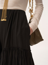 DESCRIPTION Fluid, ruffled tiered shorts in organic silk crepe de chine. PRODUCT DETAILS Ruffled tiered shorts outer shell: 100% Silk Fit: fluid - The model is 5'10" (178 cm) and wears a prototype in size 34 - Black silk shorts - Left-side zipper & hook fastening - Side pockets Organic silk manufacturing restricts the use of pesticides, insecticides or harsh chemicals and incorporates methods that respect biodiversity, improve soil quality and reduce water consumption. This product was made in collaboration with Akanjo, a certified WFTO supplier. Akanjo is a social enterprise located in Madagascar that places equal pay and employees' health & wellbeing at the core of their priorities. A long-standing partner of Chloe for 15 years, Akanjo is also committed to training and promoting craftsmanship. Color: Black Item code: CH25ASH22077001 CARE INSTRUCTIONS To preserve the integrity of your garment, please refrain from washing, entrusting its care to professional cleaning services for optimal maintenance. This garment cannot withstand any bleaching agent. To maintain its shape, gently iron this garment at a maximum sole plate temperature of 110°C, taking care to avoid any harsh pressure while ironing. Entrust this garment to a specialist for mild cleaning with tetrachloroethylene and solvent F, ensuring its delicate nature is maintained with the most care. To maintain its delicate nature, do not wet clean this garment. To best preserve its form and texture, please do not tumble dry this garment. TRACEABILITY Better traceability is central to improving our materials as well as social and environmental practices. Finishing: Italy Weaving: China