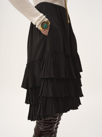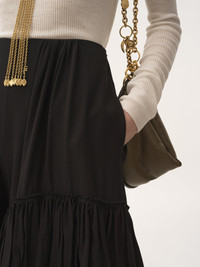 Fluid, ruffled tiered shorts in organic silk crepe de chine. PRODUCT DETAILS Ruffled tiered shorts outer shell: 100% Silk Fit: fluid - The model is 5'10" (178 cm) and wears a prototype in size 34 - Black silk shorts - Left-side zipper & hook fastening - Side pockets Organic silk manufacturing restricts the use of pesticides, insecticides or harsh chemicals and incorporates methods that respect biodiversity, improve soil quality and reduce water consumption. This product was made in collaboration with Akanjo, a certified WFTO supplier. Akanjo is a social enterprise located in Madagascar that places equal pay and employees' health & wellbeing at the core of their priorities. A long-standing partner of Chloe for 15 years, Akanjo is also committed to training and promoting craftsmanship. Color: Black Item code: CH25ASH22077001