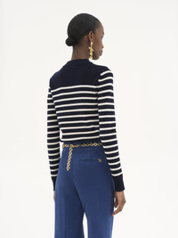 Sailor sweater in a lower-impact Chloe Mariniere wool and cashmere knit, detailed with gold-toned military buttons at the left shoulder. PRODUCT DETAILS Sailor sweater outer shell: 92% Wool, 8% Cashmere wool Fit: straight - The model is 5'10" (178 cm) and wears a prototype in size 36 - Mariniere sweater - Gold-toned military buttons at shoulder Care: dry cleaning only The wool used in this product comes from a farm that respects animal welfare, maintains soil health, protects biodiversity and promotes native species. Color: Blue & White Item code: CH25SMP1861099G