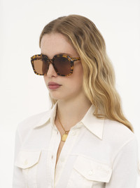 The Salome square sunglasses feature a Havana frame in lower-impact acetate with scalloped detailing and temples signed with the Chloe logo. Solid brown lenses finish these 70s-style sunglasses. PRODUCT DETAILS Square sunglasses in lower impact acetate & bio-based nylon - 100% UVA and UVB protection - Prescription friendly - Filter category: 2 - Chloe logo on both temples These sunglasses come with a case and lens cloth - Lens: 2.2" (57 mm) - Bridge: 0.7" (17 mm) - Temple: 5.5" (140 mm) - Havana frame - Solid brown lenses Item code: CHC24WEK0280212