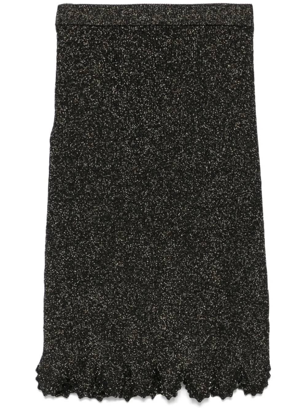 scallop knitted midi skirt Highlights - Black - Ribbed knit - Metallic threading - Scallop hem - Elasticated waistband - Knee-length Made in Italy Composition Viscose 77%, Metallic Fibre 19%, Wool 2%, Polyurethane 1%, Polyamide 1% SIZE & FIT Model measurements Height 5 ft 10 in(1.77 m) Bust/Chest 33.07 in(84 cm) Hips 37 in(94 cm) Waist 24.8 in(63 cm) FittingInformation This midi-length skirt is intended to be worn just below the waist The elasticated waist allows for a comfortable fit Made with a midweight knit, this piece offers some stretch