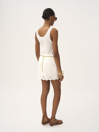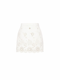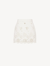 Tailored mini skirt in a quilted floral jacquard cotton mix with floral broderie anglaise and a scalloped hem. PRODUCT DETAILS Mini skirt outer shell: 55% Cotton, 28% Polyamide, 17% Linen Lining: 100% Cotton Embroidery thread: 70% Viscose, 30% Polyester Fit: straight, mini length - The model is 5'10" (178 cm) and wears a prototype in size 36 - Embroidered mini skirt - Left-side zipper & hook fastening Color: Iconic Milk Item code: CH25AJU11134107
