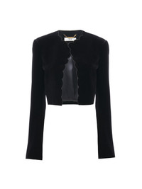 Scalloped Spencer jacket in a soft, matte cotton velvet, featuring scallop embroidery along the neck and front for signature detail. PRODUCT DETAILS Scalloped Spencer jacket outer shell: 100% Cotton Lining: 100% Silk Embroidery thread: 100% Viscose Fit: fitted - The model is 5'10" (178 cm) and wears a prototype in size 36 - Cropped velvet jacket - No fastenings Care: dry cleaning only Color: Black Item code: CH25SVE01017001