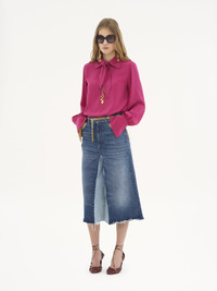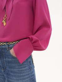 Fluid scarf-tie blouse in organic silk crepe de chine, featuring a V-neck and gathered sleeves with slit cuffs. PRODUCT DETAILS Scarf-tie blouse outer shell: 100% Silk Buttons: 100% Mother-of-pearl Fit: fluid - The model is 5'10" (178 cm) and wears a prototype in size 36 - Fluid silk blouse - Front-fastening scarf tie - Mother-of-pearl buttons at cuffs Care: dry cleaning only Organic silk manufacturing restricts the use of pesticides, insecticides or harsh chemicals and incorporates methods that respect biodiversity, improve soil quality and reduce water consumption. Color: Divine Red Item code: CH25SHT42125633