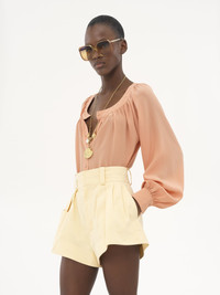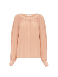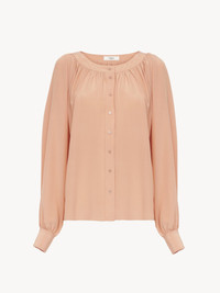 Fluid gathered scoop-neck blouse in organic silk crepe de chine with puff sleeves and mother-of-pearl buttons. PRODUCT DETAILS Scoop-neck blouse outer shell: 100% Silk Buttons: 100% Mother-of-pearl Fit: fluid - The model is 5'10" (178 cm) and wears a prototype in size 36 - Gathered silk blouse - Mother-of-pearl buttons through front & at cuffs Care: dry cleaning only Organic silk manufacturing restricts the use of pesticides, insecticides or harsh chemicals and incorporates methods that respect biodiversity, improve soil quality and reduce water consumption. Color: Blushy Pink Item code: CH25UHT62125266