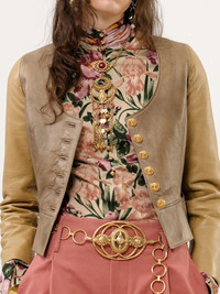 Scoop-neck jacket in soft lambskin with a cinched silhouette, featuring gold-tone buttons. PRODUCT DETAILS Scoop-neck jacket outer shell: 100% Lambskin Main lining: 62% Viscose, 38% Cotton Pocket lining: 100% Cotton Fit: cinched - The model is 5'10" (178 cm) and wears a prototype in size 36 - Leather jacket - Gold-tone buttons through front & at cuffs - Piped side pockets To make this product, Chloe worked with Leather Working Group (LWG) certified leather manufacturers. LWG certifies tanneries based on their water and energy usage, management of chemicals, solid waste, and wastewater. Color: Pale Khaki Item code: CH25ACV3220421M