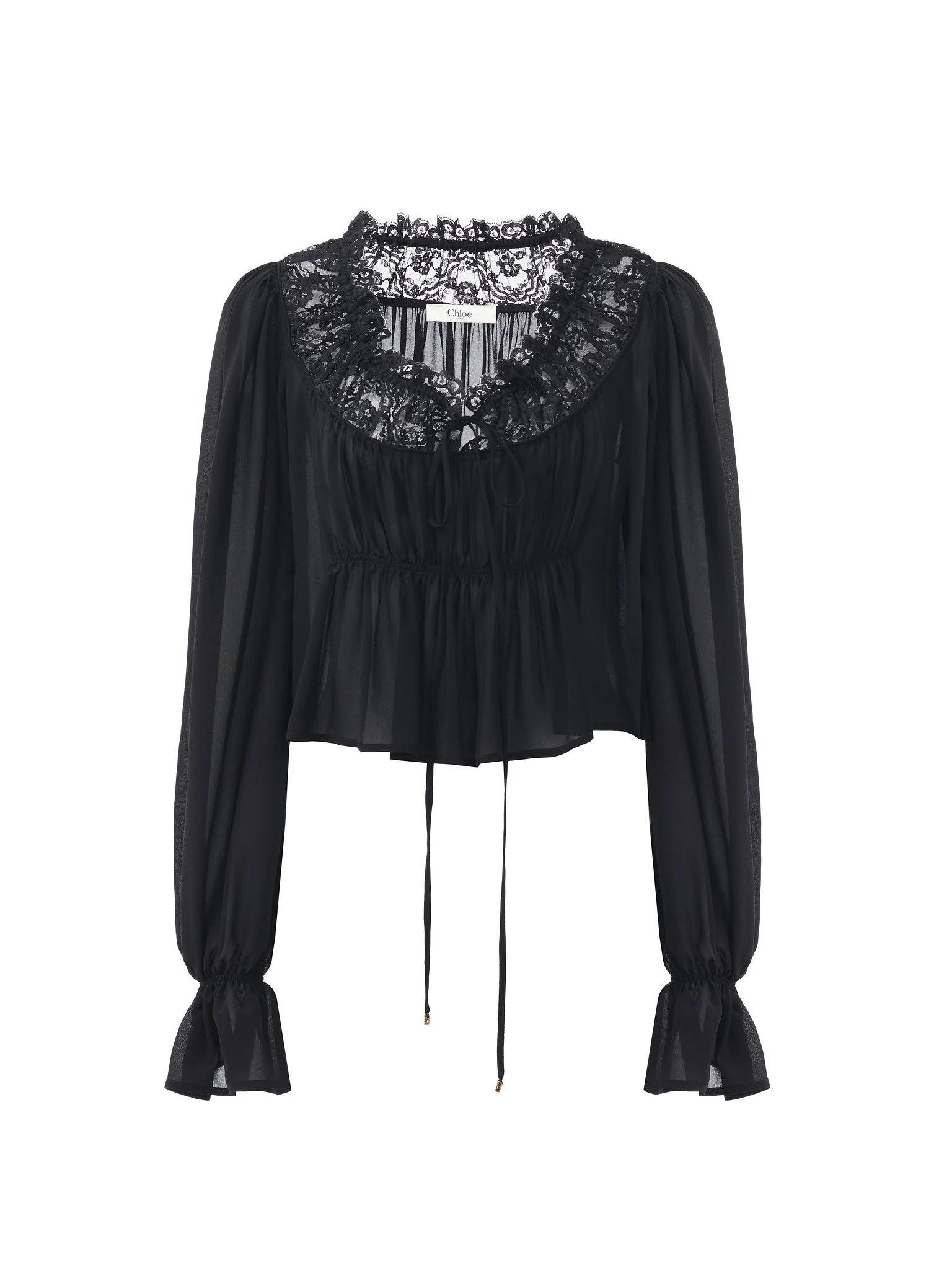 Scoop-neck cropped top in organic silk georgette with floral lace along the neckline and ruching at the front. The drawstring neck and waist have dangling ties with gold-tone metal tips. Elasticated cuffs finish this piece. PRODUCT DETAILS Scoop-neck cropped top outer shell: 100% Silk Collar lace: 100% Polyamide Fit: cropped - The model is 5'10" (178 cm) and wears a prototype in size 36 - Long-sleeve ruffle top - Drawstring neck & waist with hammered metal tips - Elasticated cuffs Organic silk manufacturing restricts the use of pesticides, insecticides or harsh chemicals and incorporates methods that respect biodiversity, improve soil quality and reduce water consumption. This product was made in collaboration with Akanjo, a certified WFTO supplier. Akanjo is a social enterprise located in Madagascar that places equal pay and employees' health & wellbeing at the core of their priorities. A long-standing partner of Chloe for 15 years, Akanjo is also committed to training and promoting craftsmanship. Color: Black Item code: CH25AHT87117001