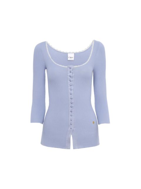 Scoop-neck fitted cardigan in tubular cotton with three-quarter sleeves, featuring a scalloped lace trim, fabric-covered buttons and a gold-tone medal at the hip. PRODUCT DETAILS Fitted cardigan outer shell: 100% Cotton Fit: fitted - The model is 5'10" (178 cm) and wears a prototype in size S - Scoop-neck cardigan - Fabric-covered buttons through front - Gold-tone medal at the hip Color: Idyllic Blue Item code: CH25WJC0118549U