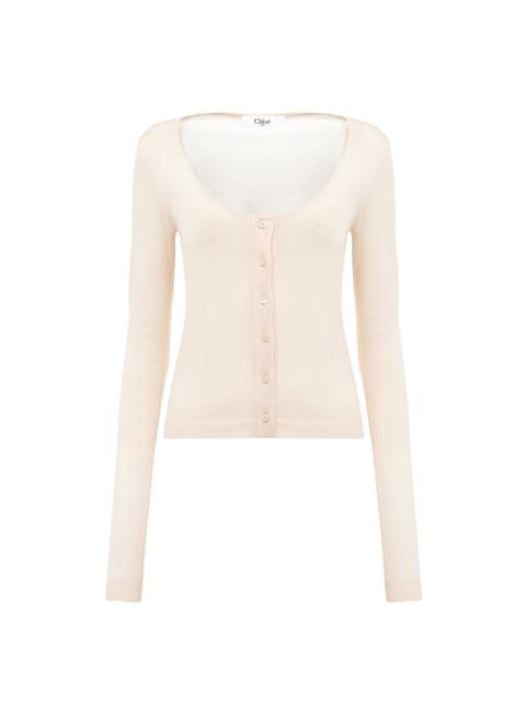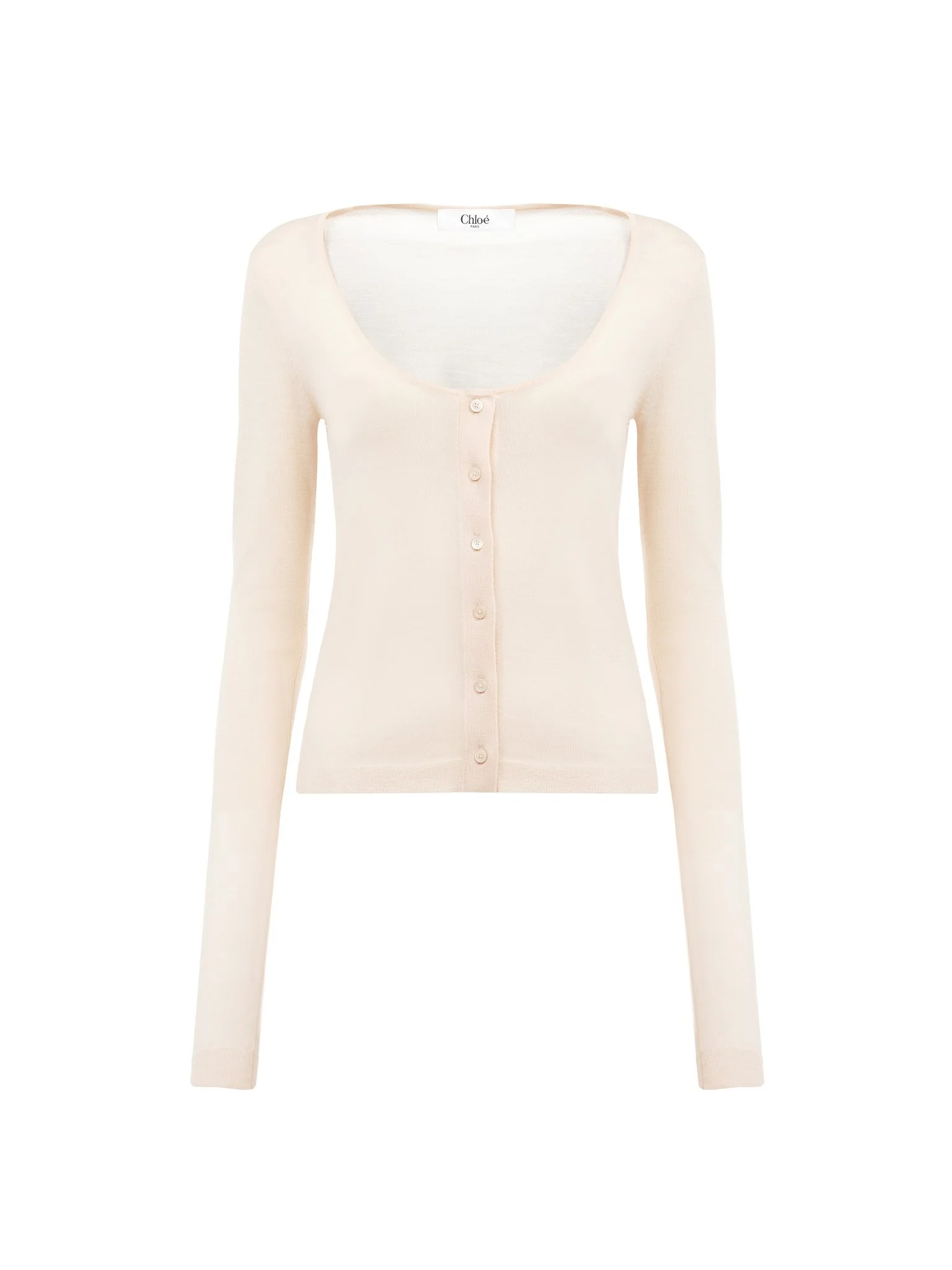 Scoop-neck fitted cardigan in a lower-impact superfine wool ribbed knit, with mother-of-pearl buttons through the front and tonal Chloe logo embroidery at the left hip. PRODUCT DETAILS Fitted cardigan outer shell: 100% Wool Buttons: 100% Mother-of-pearl Fit: fitted - The model is 5'10" (178 cm) and wears a prototype in size S - Knitted cardigan - Mother-of-pearl buttons through front Care: gentle wash 90°F (30°C) Color: Sorbet Yellow Item code: CH25UMC03767722