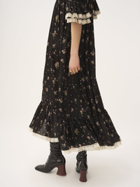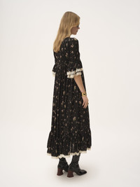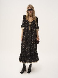 Scoop-neck midi dress in silk charmeuse with an all-over Liberty print and lace trims. The gathered silhouette includes a silk-mix lining, while ruffled trims detail the hem and elbow-length sleeves. PRODUCT DETAILS Scoop-neck midi dress outer shell: 100% Silk Lining: 68% Acetate fiber, 32% Silk Lacework: 100% Cotton Fit: fluid, midi length - The model is 5'10" (178 cm) and wears a prototype in size 34 - Printed midi dress - Left-side zipper - Side pockets This product was made in collaboration with Akanjo, a certified WFTO supplier. Akanjo is a social enterprise located in Madagascar that places equal pay and employees' health & wellbeing at the core of their priorities. A long-standing partner of Chloe for 15 years, Akanjo is also committed to training and promoting craftsmanship. Color: Black Item code: CH25ARO35481001