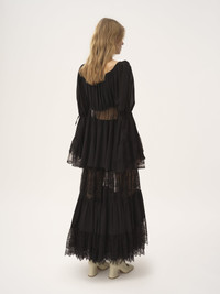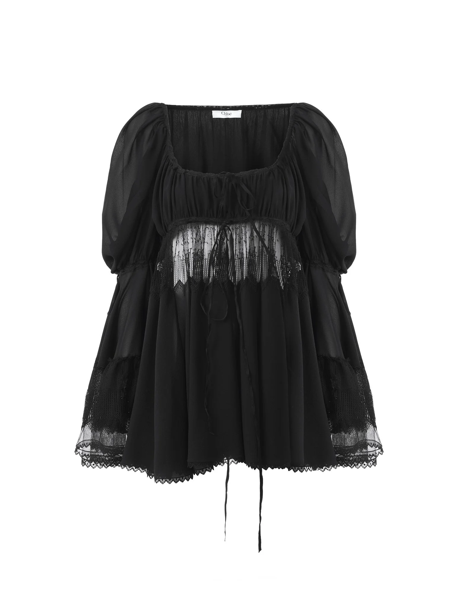 Puff-sleeve ruffle top in organic silk georgette with a separate lining and lace inserts at the waist and cuffs. Drawstring ties gather the scoop-neck silhouette, while fabric-covered buttons detail the left side. PRODUCT DETAILS Puff-sleeve ruffle top outer shell: 100% Silk Secondary material: 100% Polyamide Separate lining: 100% Silk Main lacework: 83% Polyamide, 17% Viscose Sleeve braid: 65% Cupro, 35% Cotton Fit: fluid - The model is 5'10" (178 cm) and wears a prototype in size 36 - Puff-sleeve silk top - Fabric-covered buttons at left side - Separate lining Organic silk manufacturing restricts the use of pesticides, insecticides or harsh chemicals and incorporates methods that respect biodiversity, improve soil quality and reduce water consumption. This product was made by Marie Helene Couture, a long-standing partner of Chloe based in Morlaas, France. Marie Helene Couture excels in the specialized technique of couture "flou." Their expertise aligns with the rigorous standards set by the "metiers de la mode, vetement flou" certification, ensuring a high level of professional aptitude in this delicate and skilled art form. Color: Black Item code: CH25AHT77117001