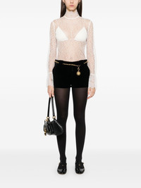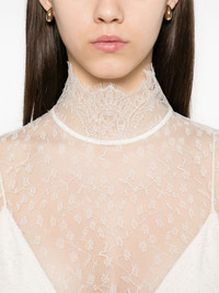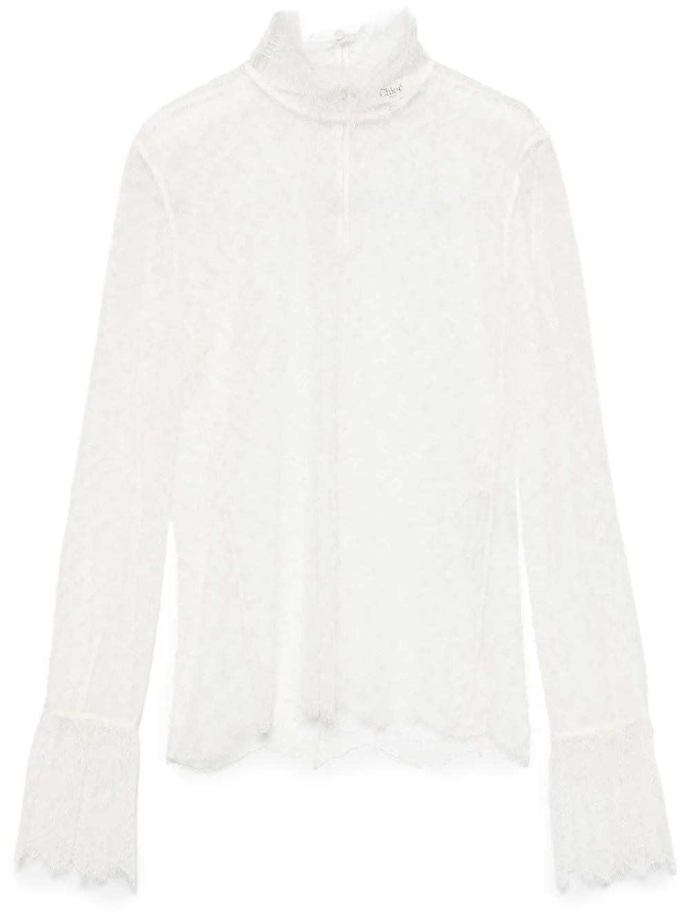 lace blouse Highlights - White - Rear button fastening - Semi-sheer construction - Mock neck - Long sleeves Imported Composition Polyamide 72%, Viscose 28% SIZE & FIT Model measurements Height 5 ft 10 in(1.78 m) Bust/Chest 33.85 in(86 cm) Hips 36.61 in(93 cm) Waist 26.77 in(68 cm) FittingInformation Designed for a slim fit that sits just away from the body offering a close yet comfortable fit Made from a lightweight non-stretch fabric, this piece offers minimal elasticity when worn