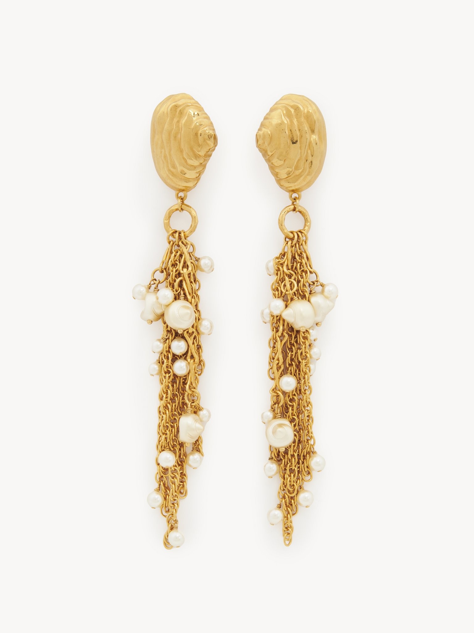 Chloe Shells dangling earrings in vintage gold brass. Textured shell studs are combined with chain tassels embellished with synthetic pearls in various shapes and sizes. A Chloe logo engraving finishes these earrings. PRODUCT DETAILS Dangling earrings in brass & synthetic pearls - One size only - Suitable for pierced ears only - Pin & clip closure - Chloe logo engraving To ensure this item's quality and longevity, wear it regularly and avoid exposure to direct sunlight and heat. Avoid impact, and contact with water, perfume or chlorine. Store your jewel in its pouch and box when not in use. Color: Vintage Gold Item code: CHC25UFE31LBR9DC