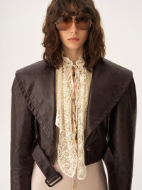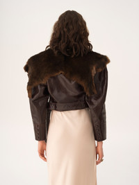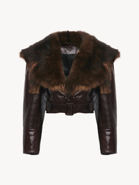 DESCRIPTION Cropped fitted jacket in '70s-inspired shiny calfskin, featuring a removable maxi shearling collar, leather-covered horn buttons and a buckled belt. PRODUCT DETAILS Fitted jacket outer shell: 100% Cowhide Secondary material: 100% Lambskin Lining: 100% Cupro Inside buttons: 100% Water buffalo horn Fit: cropped, fitted - The model is 5'10" (178 cm) and wears a prototype in size 36 - Leather jacket - Leather-covered buttons - Engraved horn buttons - Removable fur collar - Buckled belt with loops To make this product, Chloe worked with Leather Working Group (LWG) certified leather manufacturers. LWG certifies tanneries based on their water and energy usage, management of chemicals, solid waste, and wastewater. Color: Opaque Brown Item code: CH25WCV5522322Q CARE INSTRUCTIONS To preserve the integrity of your garment, please refrain from washing, entrusting its care to professional cleaning services for optimal maintenance. This garment cannot withstand any bleaching agent. To maintain its shape, refrain from ironing this garment. To best preserve its texture and form, do not dry clean this garment. To maintain its delicate nature, do not wet clean this garment. To best preserve its form and texture, please do not tumble dry this garment. TRACEABILITY Better traceability is central to improving our materials as well as social and environmental practices. Finishing: Italy Tanning: Italy