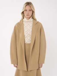 Made from a lower-impact double-face wool and cashmere blend, this short belted coat combines a classic silhouette with rounded sleeves for a soft, feminine finish. The self-fabric belt elegantly cinches the waist. PRODUCT DETAILS Double-breasted coat main material: 70% Wool, 30% Cashmere Pocket lining: 100% Silk Button: 100% Horn Care: dry cleaning only Fit: short - The model is 5'10'' (178 cm) and wears a prototype in size 36 - Short wool coat - Self-fabric belt - Horn button fastening The wool used in this product comes from a farm that respects animal welfare, maintains soil health, protects biodiversity and promotes native species. Color: Pearl Beige Item code: CHC23WMA22071278