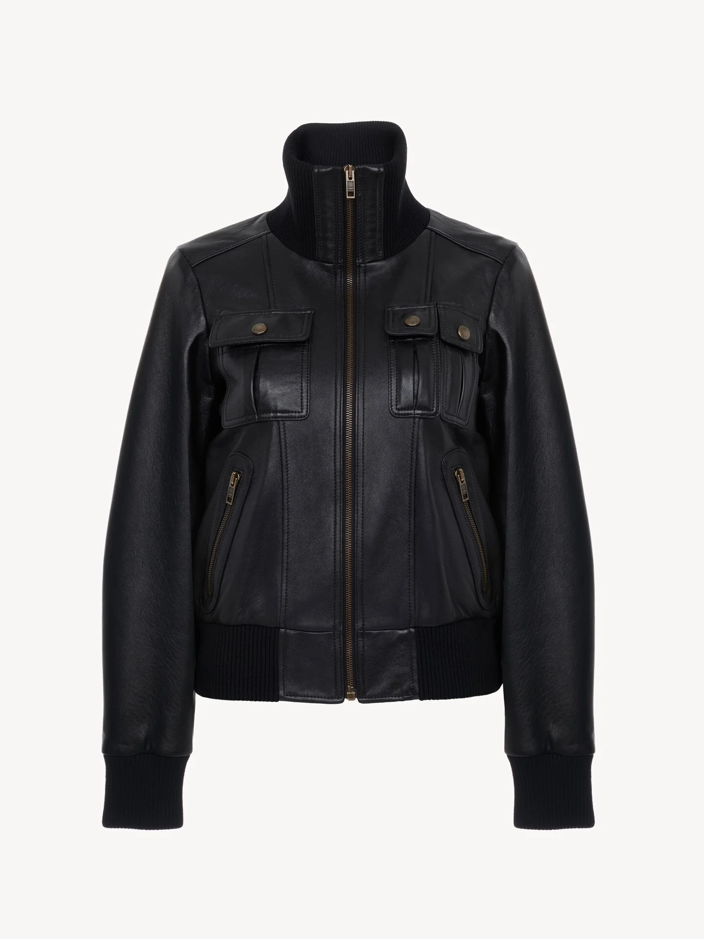 DESCRIPTION Short blouson jacket in soft lambskin, featuring multiple zipped and flap pockets, together with ribbed trims. PRODUCT DETAILS Blouson outer shell: 100% Sheepskin Main lining: 62% Viscose, 38% Cotton Pocket lining: 100% Cotton Ribbed hem: 88% Wool, 10% Polyamide, 2% Elastane Fit: straight - The model is 5'10" (178 cm) and wears a prototype in size 36 - Leather blouson jacket - Front zipper - 3 chest flap pockets with snap buttons - Zipped front pockets To make this product, Chloe worked with Leather Working Group (LWG) certified leather manufacturers. LWG certifies tanneries based on their water and energy usage, management of chemicals, solid waste, and wastewater. Color: Black Item code: CH25ACV34204001 CARE INSTRUCTIONS To maintain its quality, entrust this garment to a leather specialist only. To preserve the integrity of your garment, please refrain from washing, entrusting its care to professional cleaning services for optimal maintenance. This garment cannot withstand any bleaching agent. To maintain its shape, refrain from ironing this garment. To best preserve its texture and form, do not dry clean this garment. To maintain its delicate nature, do not wet clean this garment. To best preserve its form and texture, please do not tumble dry this garment. TRACEABILITY Better traceability is central to improving our materials as well as social and environmental practices. Finishing: Italy Tanning: Italy