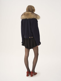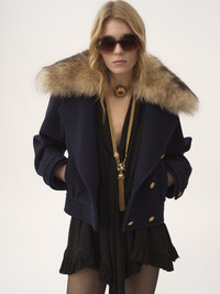 Short boxy double-breasted coat in iconic soft wool, featuring ribbed gold-tone buttons and a removable shearling collar. PRODUCT DETAILS Boxy double-breasted coat outer shell: 80% Wool, 20% Polyamide Main lining: 62% Viscose, 38% Cotton Detachable collar: 100% Lambskin Buttons: 100% Water buffalo horn Fit: boxy - The model is 5'10" (178 cm) and wears a prototype in size 36 - Double-breasted wool coat - Gold-tone buttons through front & cuffs - Engraved horn buttons at collar - Piped side pockets - Removable shearling collar Color: Evening Blue Item code: CH25AMA0195248B
