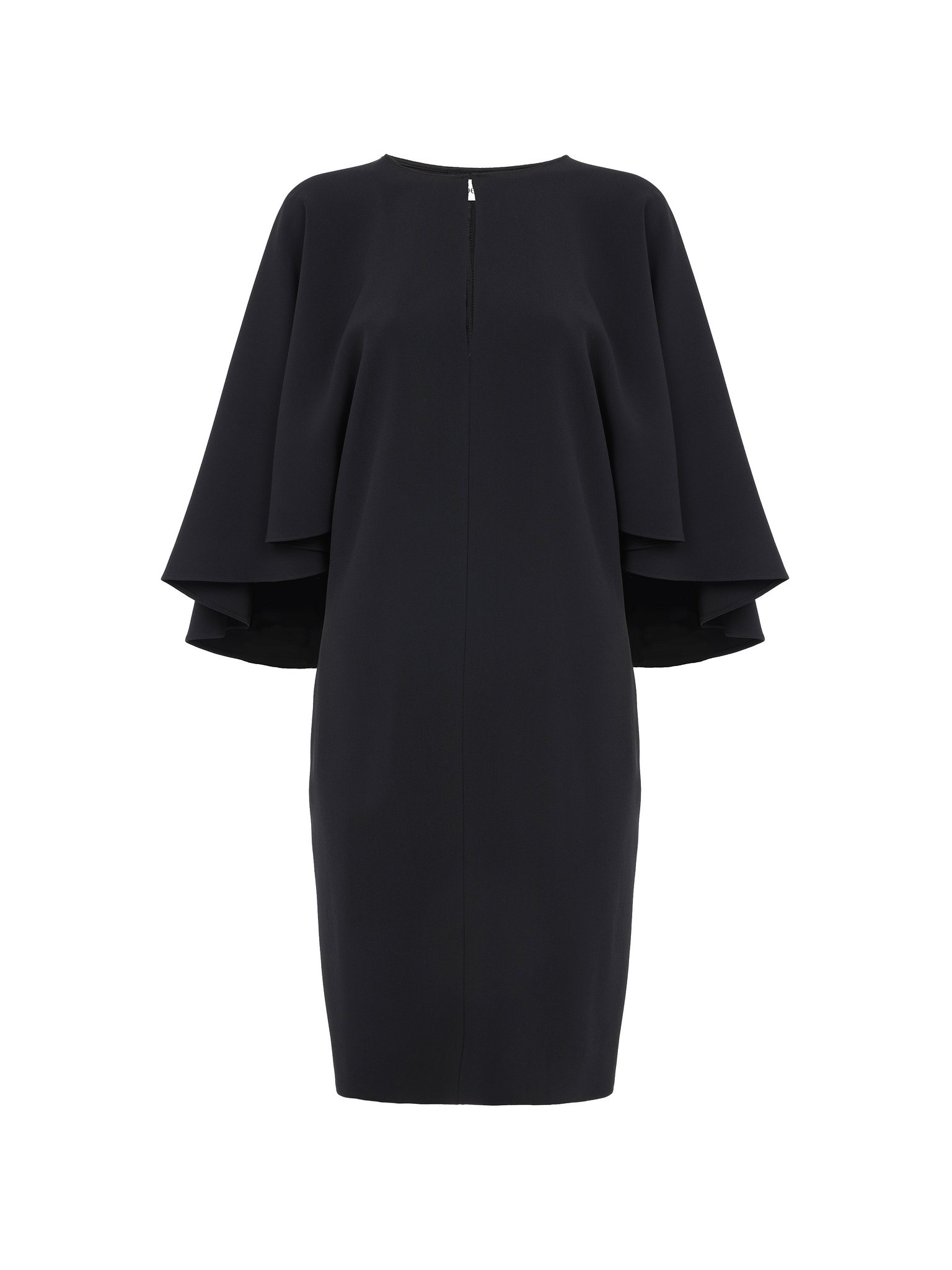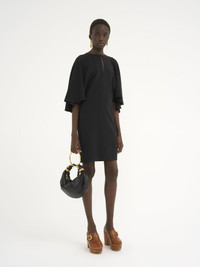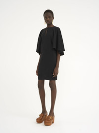 Short cape dress in a soft viscose and crêpe blend. PRODUCT DETAILS Short cape dress outer shell: 50% Acetate fiber, 47% Viscose, 3% Elastane Care: dry cleaning only Fit: above the knee - The model is 5'10" (178 cm) and wears a prototype in size 36 - Little black dress - Invisible back zipper - Drop metal button at front of neck Color: Black Item code: CH24ARO20033001