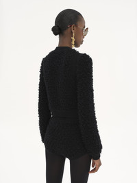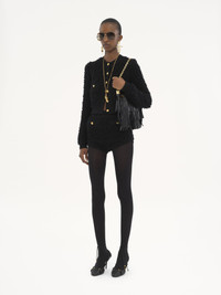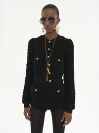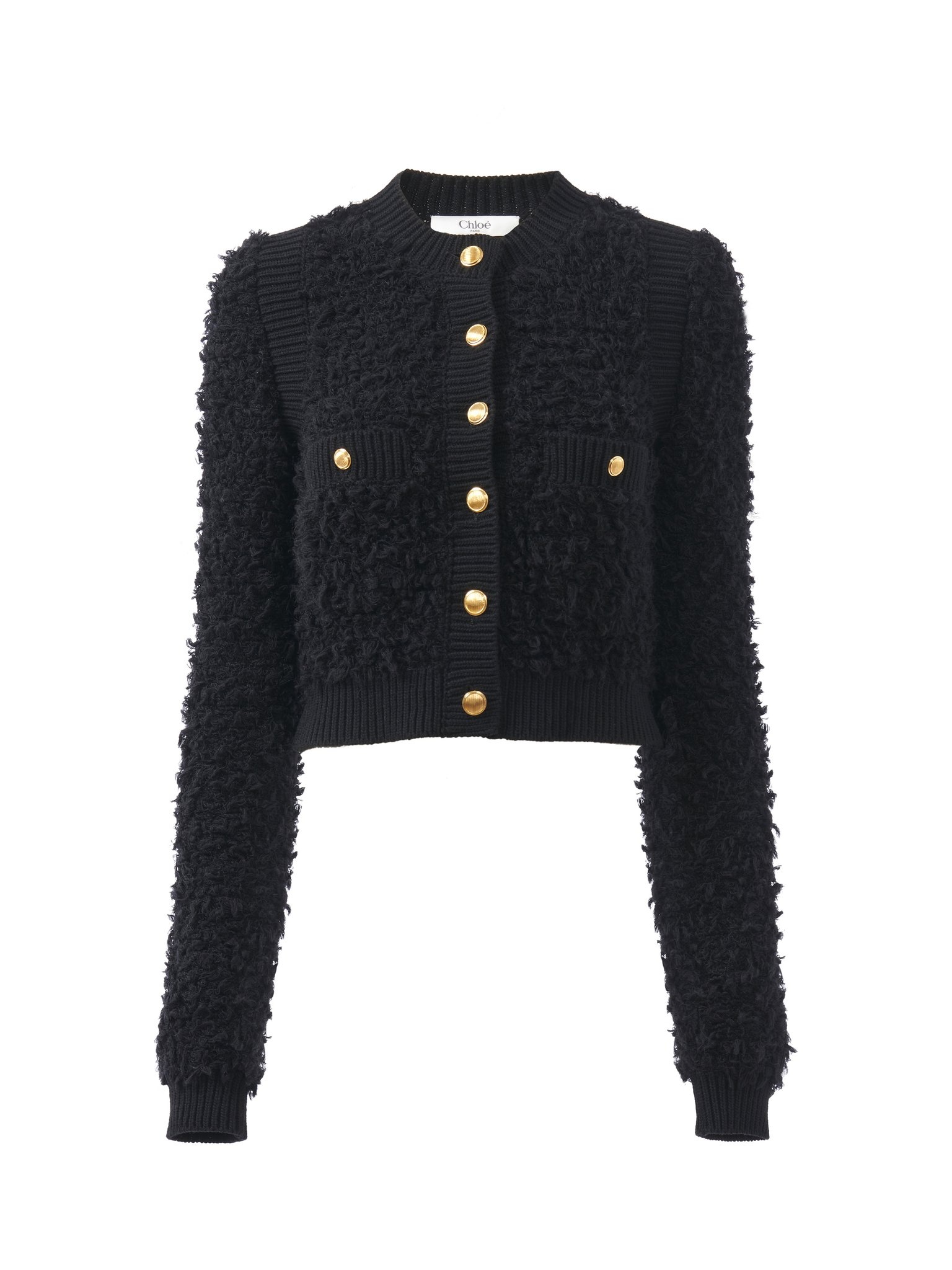 Crew-neck short fitted cardigan in a textured tweed knit, featuring gold-toned ribbed buttons, patch pockets and ribbed trim. PRODUCT DETAILS Short fitted cardigan outer shell: 38% Mohair wool, 34% Wool, 19% Polyamide, 5% Silk, 4% Cashmere wool Ribbed hem: 90% Wool, 10% Cashmere wool Fit: fitted - The model is 5'10" (178 cm) and wears a prototype in size 36 - Crew-neck cardigan - Gold-toned ribbed buttons through front - Buttoned front patch pockets Care: dry cleaning only Color: Black Item code: CH25SMC03700001