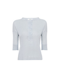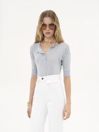 Short-sleeve Henley shirt in a linen-silk mix fine flame knit, detailed with mother-of-pearl buttons. PRODUCT DETAILS Short-sleeve Henley shirt outer shell: 63% Linen, 37% Silk Buttons: 100% Mother-of-pearl Fit: fitted - The model is 5'10" (178 cm) and wears a prototype in size S - Short-sleeve knit top - Mother-of-pearl buttons at front Care: dry cleaning only Color: Silky Blue Item code: CH25UMP06667472