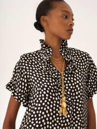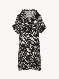 DESCRIPTION V-neck mini dress in silk jacquard with a dots print, featuring maxi short sleeves, ruffles and mother-of-pearl buttons. PRODUCT DETAILS Short-sleeve mini dress outer shell: 100% Silk Buttons: 100% Mother-of-pearl Fit: fluid, mini length - The model is 5'10" (178 cm) and wears a prototype in size 36 - Printed silk dress - Mother-of-pearl buttons at front Color: Black Item code: CH26SRO50300915 CARE INSTRUCTIONS To preserve the integrity of your garment, please refrain from washing, entrusting its care to professional cleaning services for optimal maintenance. This garment cannot withstand any bleaching agent. To maintain its shape, gently iron this garment at a maximum sole plate temperature of 110°C, taking care to avoid any harsh pressure while ironing. Entrust this garment to a specialist for mild cleaning with tetrachloroethylene and solvent F, ensuring its delicate nature is maintained with the most care. To best preserve its form and texture, please do not tumble dry this garment. To maintain its delicate nature, do not wet clean this garment. TRACEABILITY Better traceability is central to improving our materials as well as social and environmental practices. Finishing: Italy Weaving: China