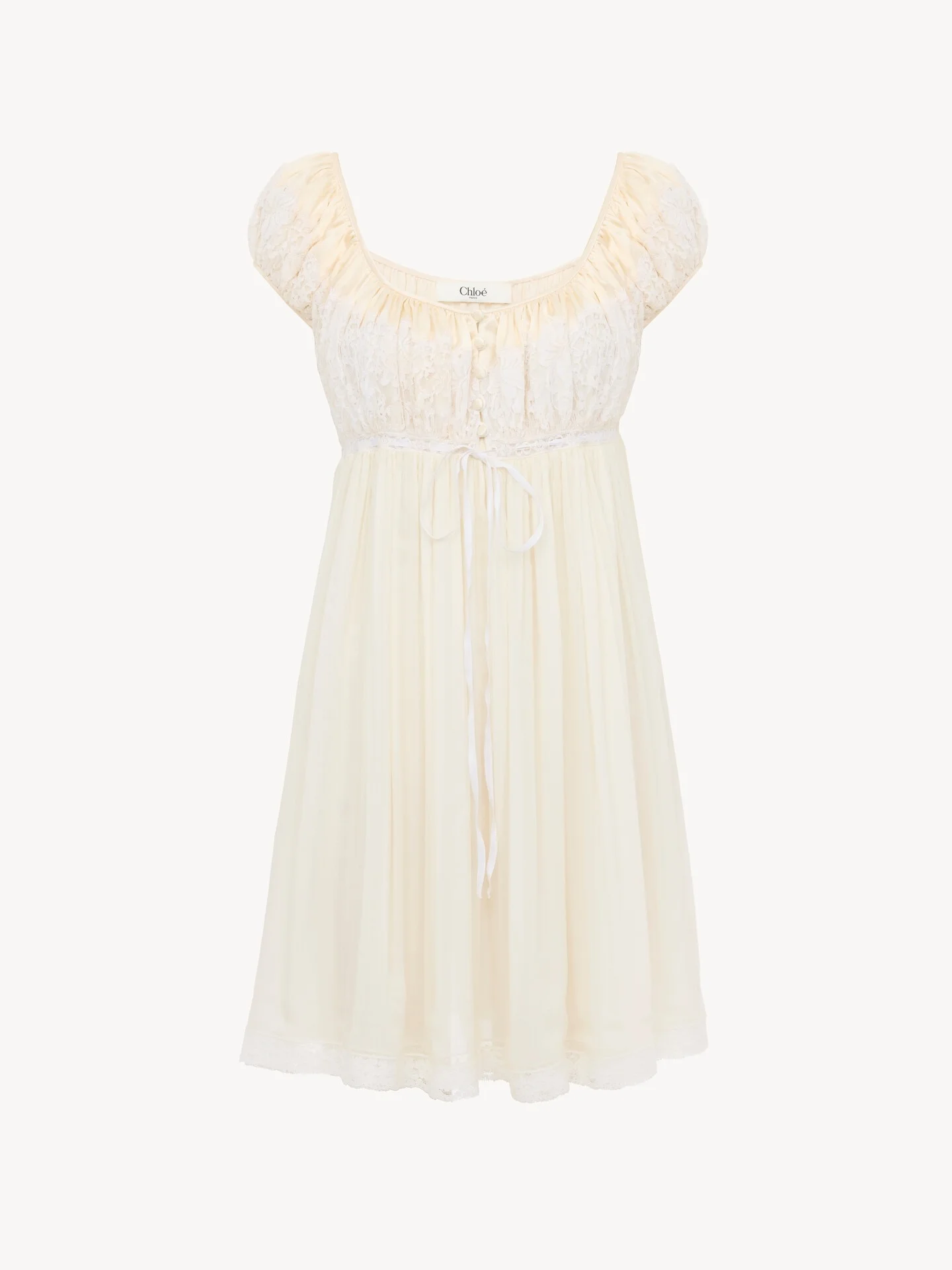 DESCRIPTION Gathered short-sleeve mini dress in iconic organic silk mousseline with a silk-mix lining and lace trim, featuring a scoop neck, fabric-covered buttons and a drawstring chest. PRODUCT DETAILS Short-sleeve mini dress outer shell: 100% Silk Lining: 90% Acetate fiber, 10% Silk Upper lacework: 76% Cotton, 24% Polyamide Lower lacework: 90% Cotton, 10% Polyamide Fit: fluid, mini length - The model is 5'10" (178 cm) and wears a prototype in size 36 - Scoop-neck mini dress - Fabric-covered buttons at front - Drawstring chest Organic silk manufacturing restricts the use of pesticides, insecticides or harsh chemicals and incorporates methods that respect biodiversity, improve soil quality and reduce water consumption. This product was made in collaboration with Akanjo, a certified WFTO supplier. Akanjo is a social enterprise located in Madagascar that places equal pay and employees' health & wellbeing at the core of their priorities. A long-standing partner of Chloe for 15 years, Akanjo is also committed to training and promoting craftsmanship. Color: Whisper White Item code: CH26SRO31001113 CARE INSTRUCTIONS To preserve the integrity of your garment, please refrain from washing, entrusting its care to professional cleaning services for optimal maintenance. This garment cannot withstand any bleaching agent. To maintain its shape, gently iron this garment at a maximum sole plate temperature of 110°C, taking care to avoid any harsh pressure while ironing. Entrust this garment to a specialist for mild cleaning with tetrachloroethylene and solvent F, ensuring its delicate nature is maintained with the most care. To best preserve its form and texture, please do not tumble dry this garment. To maintain its delicate nature, do not wet clean this garment. TRACEABILITY Better traceability is central to improving our materials as well as social and environmental practices. Dyeing: France Finishing: France Weaving: France