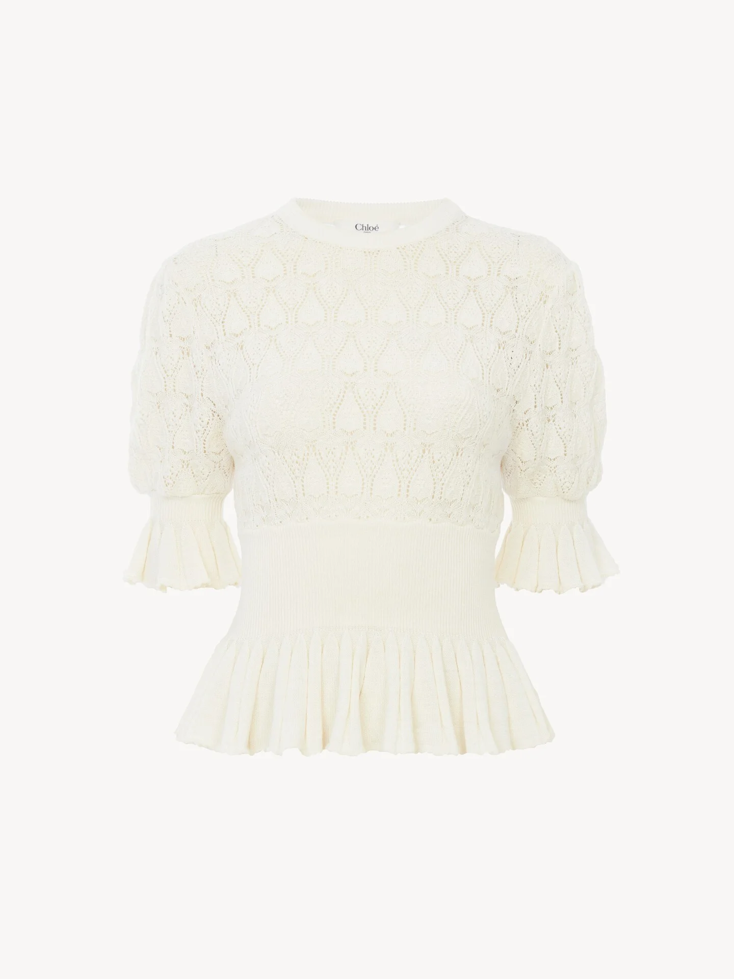 DESCRIPTION Short-sleeve ruffled sweater in a baroque pointelle knit with ribbed and flared trims, signed with baroque "C" embroidery at the back. PRODUCT DETAILS Ruffled sweater outer shell: 50% Wool, 50% Viscose Fit: fit & flare - The model is 5’10” (178 cm) and wears a prototype in size S - Short-sleeve knit sweater - Slips on Color: Iconic Milk Item code: CH25WMP45596107 CARE INSTRUCTIONS To preserve the integrity of your garment, please refrain from washing, entrusting its care to professional cleaning services for optimal maintenance. This garment cannot withstand any bleaching agent. To maintain its shape, gently iron this garment at a maximum sole plate temperature of 110°C, taking care to avoid any harsh pressure while ironing. Entrust this garment to a specialist for mild cleaning with tetrachloroethylene and solvent F, ensuring its delicate nature is maintained with the most care. To maintain its delicate nature, do not wet clean this garment. To best preserve its form and texture, please do not tumble dry this garment.