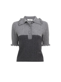 Bicolor short-sleeve polo sweater in a lower-impact wool and cashmere knit, featuring ruffle trims, fabric-covered buttons and Chloe logo embroidery at the hip. PRODUCT DETAILS Polo sweater outer shell: 70% Wool, 30% Cashmere Wool Fit: straight - The model is 5’10” (178 cm) and wears a prototype in size S - Short-sleeve knit sweater - Fabric-covered buttons at front The wool used in this product comes from a farm that respects animal welfare, maintains soil health, protects biodiversity and promotes native species. Color: Confident Grey Item code: CH25WMP41570051