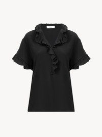 DESCRIPTION Short-sleeve ruffle top in organic silk crepe de chine with mother-of-pearl buttons. PRODUCT DETAILS Ruffle top outer shell: 100% Silk Buttons: 100% Mother-of-pearl Fit: fluid - The model is 5'10" (178 cm) and wears a prototype in size 36 - Short-sleeve silk top - Mother-of-pearl buttons at front Organic silk manufacturing restricts the use of pesticides, insecticides or harsh chemicals and incorporates methods that respect biodiversity, improve soil quality and reduce water consumption. Color: Black Item code: CH26SHT33005001 CARE INSTRUCTIONS To preserve the integrity of your garment, please refrain from washing, entrusting its care to professional cleaning services for optimal maintenance. This garment cannot withstand any bleaching agent. To maintain its shape, gently iron this garment at a maximum sole plate temperature of 110°C, taking care to avoid any harsh pressure while ironing. Entrust this garment to a specialist for mild cleaning with tetrachloroethylene and solvent F, ensuring its delicate nature is maintained with the most care. To best preserve its form and texture, please do not tumble dry this garment. To maintain its delicate nature, do not wet clean this garment. TRACEABILITY Better traceability is central to improving our materials as well as social and environmental practices. Dyeing: Italy Finishing: Italy Weaving: Italy